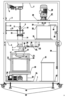 攪拌裝置,就是在第三層支架3的右側(cè)有一臺(tái)攪拌電機(jī)26,攪拌電機(jī)26豎直倒立放置。將攪拌電機(jī)的法蘭27用螺絲固定在支架層3上的架板28上。在攪拌電機(jī)26的旋轉(zhuǎn)軸上接攪拌器29,攪拌電機(jī)26正下方有一個(gè)圓柱形儲(chǔ)水桶30,攪拌器29需能夠伸入到儲(chǔ)水桶30中,儲(chǔ)水桶30被螺絲固定在第二層支架2右側(cè)的架板31上。儲(chǔ)水桶30底部有一出水孔,鋼制水管32成90度,其一端連接在該孔,另一端與電磁閥33的一端相連,電磁閥33的另一端與止水閥門34的一端用鋼制水管35相連。鋼制水管36成90度,其一端與止水閥門34的另一端相連,鋼制水管36的另一端與軟水管37的一端相連,軟水管37的另一端需能夠伸入到漏斗無底圓柱形水桶18中。支架右側(cè)有一進(jìn)水管39,進(jìn)水管39一端接水源,另一端接電磁閥38的一端,電磁閥38的另一端與U形水管40的一端相連,U形水管40的另一端伸入到儲(chǔ)水桶30中。